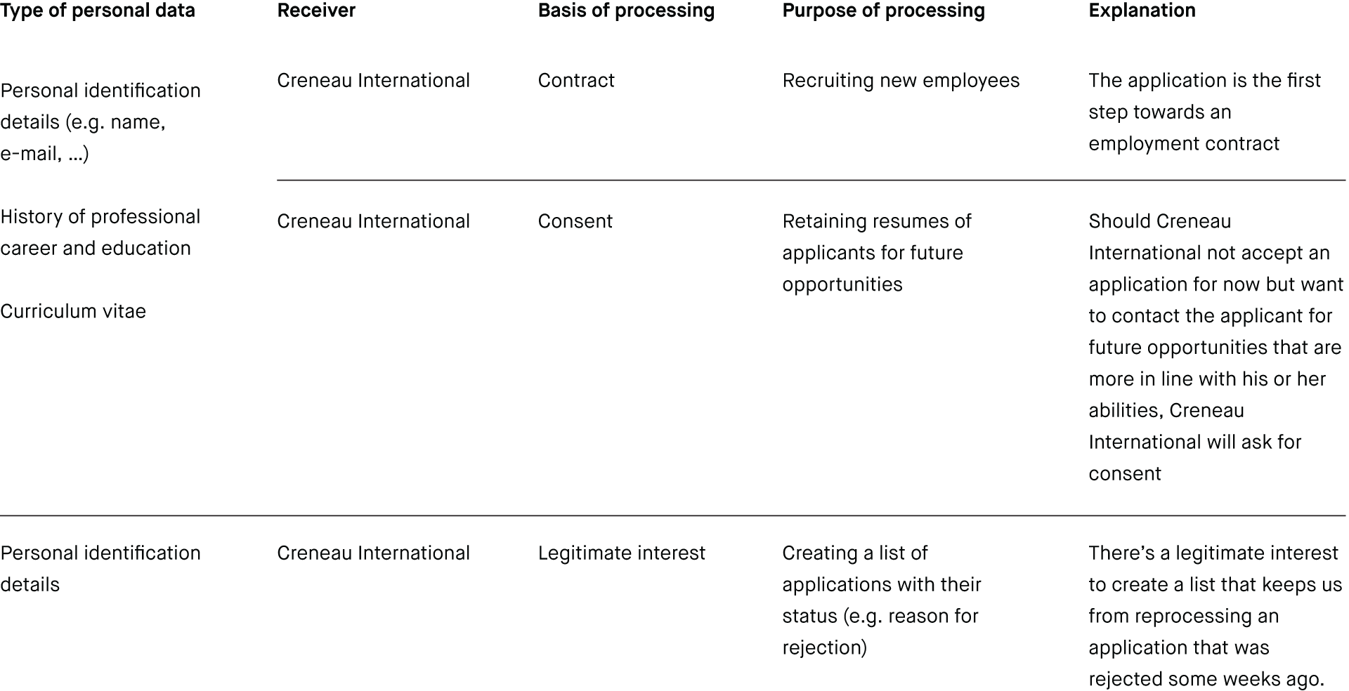 Creneau International is regularly looking for new enthusiastic and motivated employees to strengthen our team. During the application procedure, personal information such as identification details, competences and resumes are processed. When the applicant is not hired, Creneau International will ask for consent to retain information such as your resume to contact you in the future. Creneau International will also create a list of only name, date and the reason for rejecting the application.