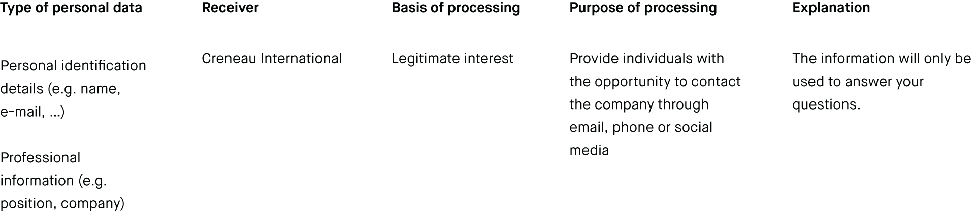 You may contact Creneau International as an individual through several channels (phone, email, contact form website, social media). The personal data you provide by phone, mail, chat or a web form is used to answer your questions only.