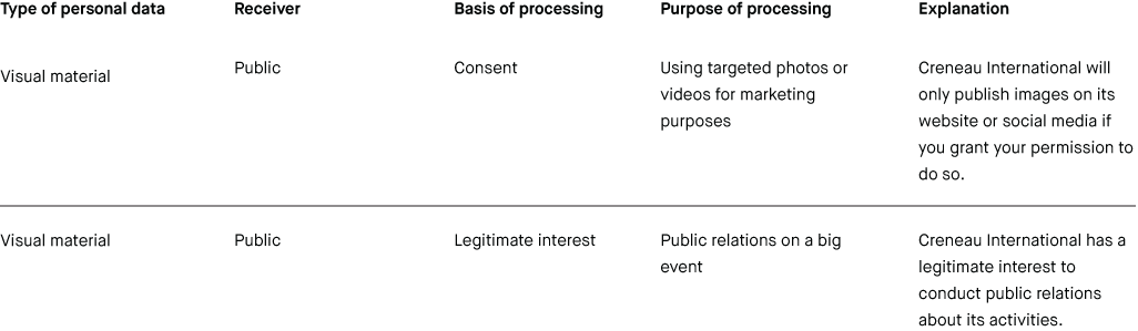 When Creneau International is working on commission, Creneau International acts as processor. Creneau International undertakes to process data only as instructed by the data controller. Those processing operations are outside the scope of this Privacy Policy.