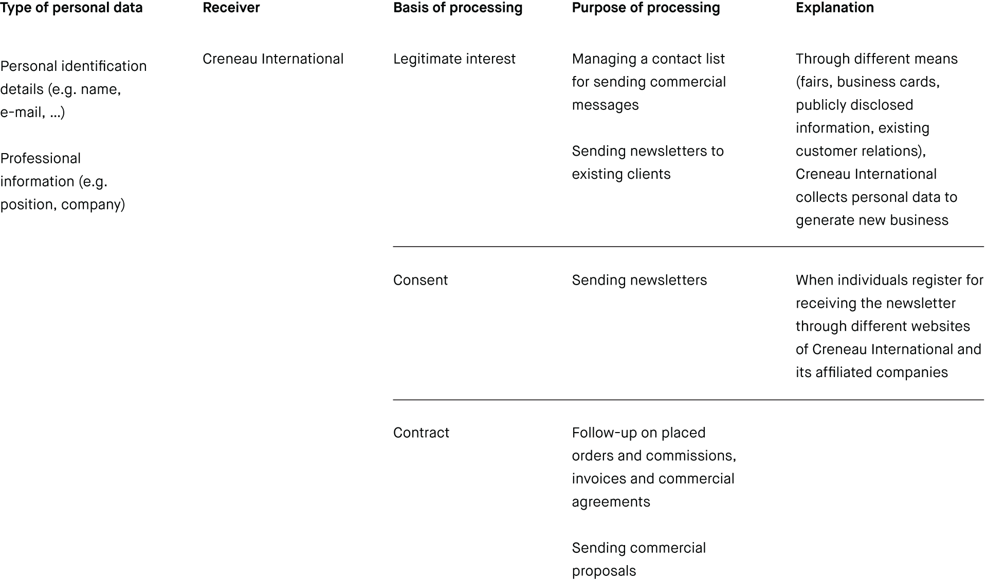 Creneau International creates a list (CRM) of contact details of customers, suppliers and prospects with the purpose of sending them commercial messages and proposals or for follow-ups on existing contracts and/or commissions. The list is used to invite existing business partners to networking events as well.