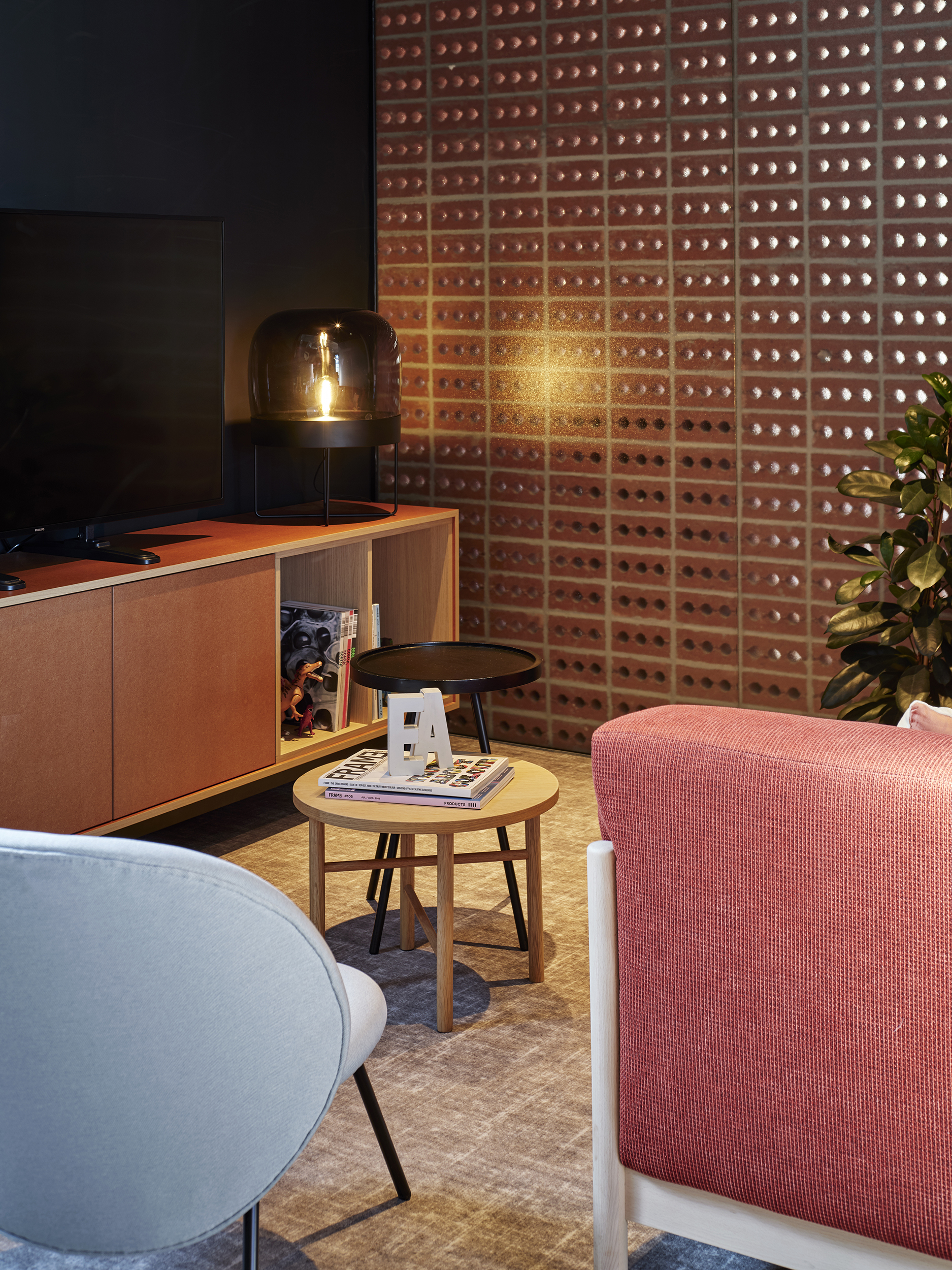 The entrance of the offices is not a classic entrance with a receptionist. It looks more like a hotel lobby or a bar. This multifunctional space focuses on the interaction between the two companies. We called it Basecamp.