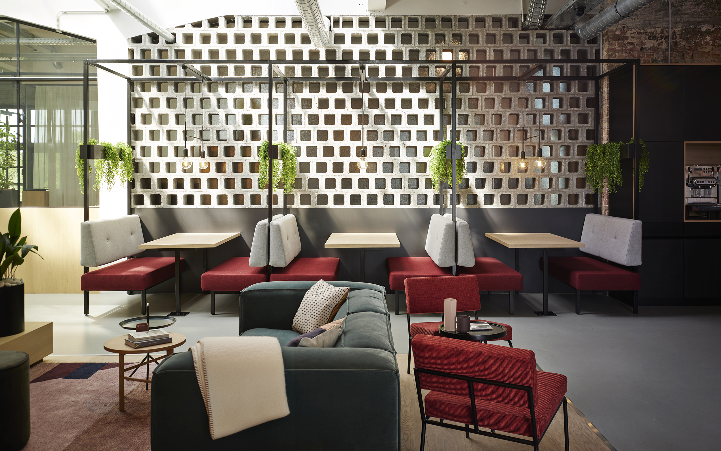 Overall, Basecamp has natural and earthy tones. The two brickwork walls add a surprising texture and a graphic rhythm to the space. The green bar with terrazzo worktop has purposely been highlighted to draw attention to the social side of this area. When the sun is out, ‘common sky’, the 150 sqm terrace, offers a beautiful outdoor extension for all employees.