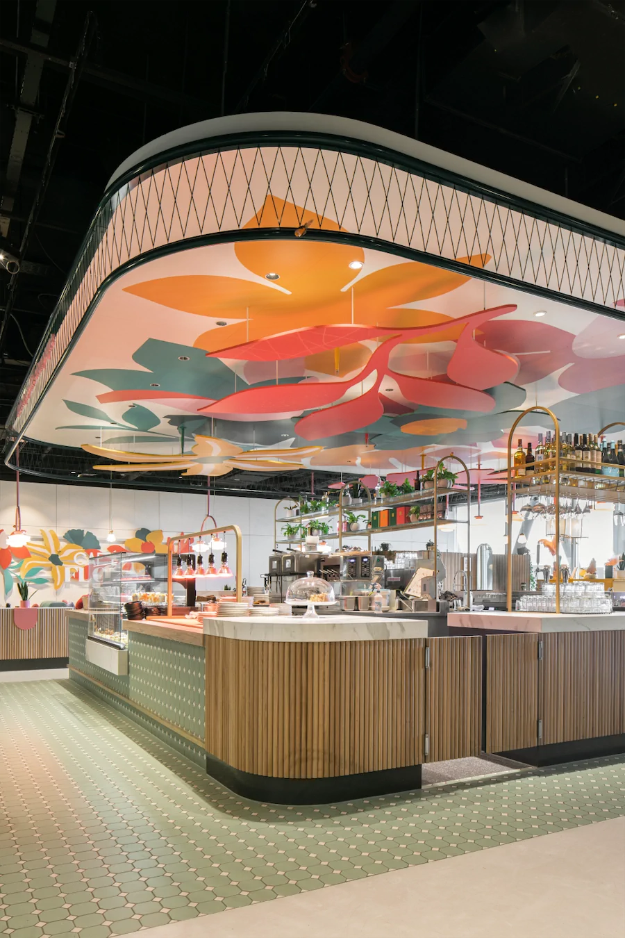 A place for The Ambitious City Girl: Schiphol airport had a very clear target audience in mind. Lots of color, a central bar with botanical graphics, while lattes and cocktails are stealing the show.