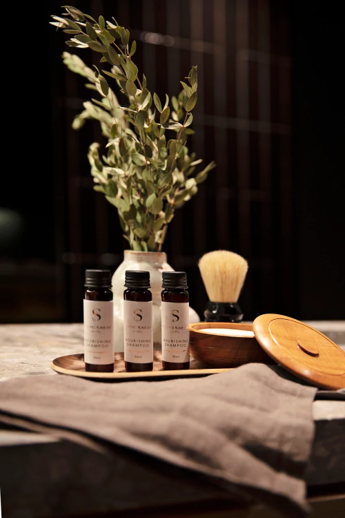 First, the hotel needed a rebranding. The logo and the graphics are inspired by the environment of the hotel. Literally. Our graphic designer went into the woods to collect twigs, leaves, berries, etcetera. He used these objects from nature and experimented with them by making scans and stamps and turning those into a collage.