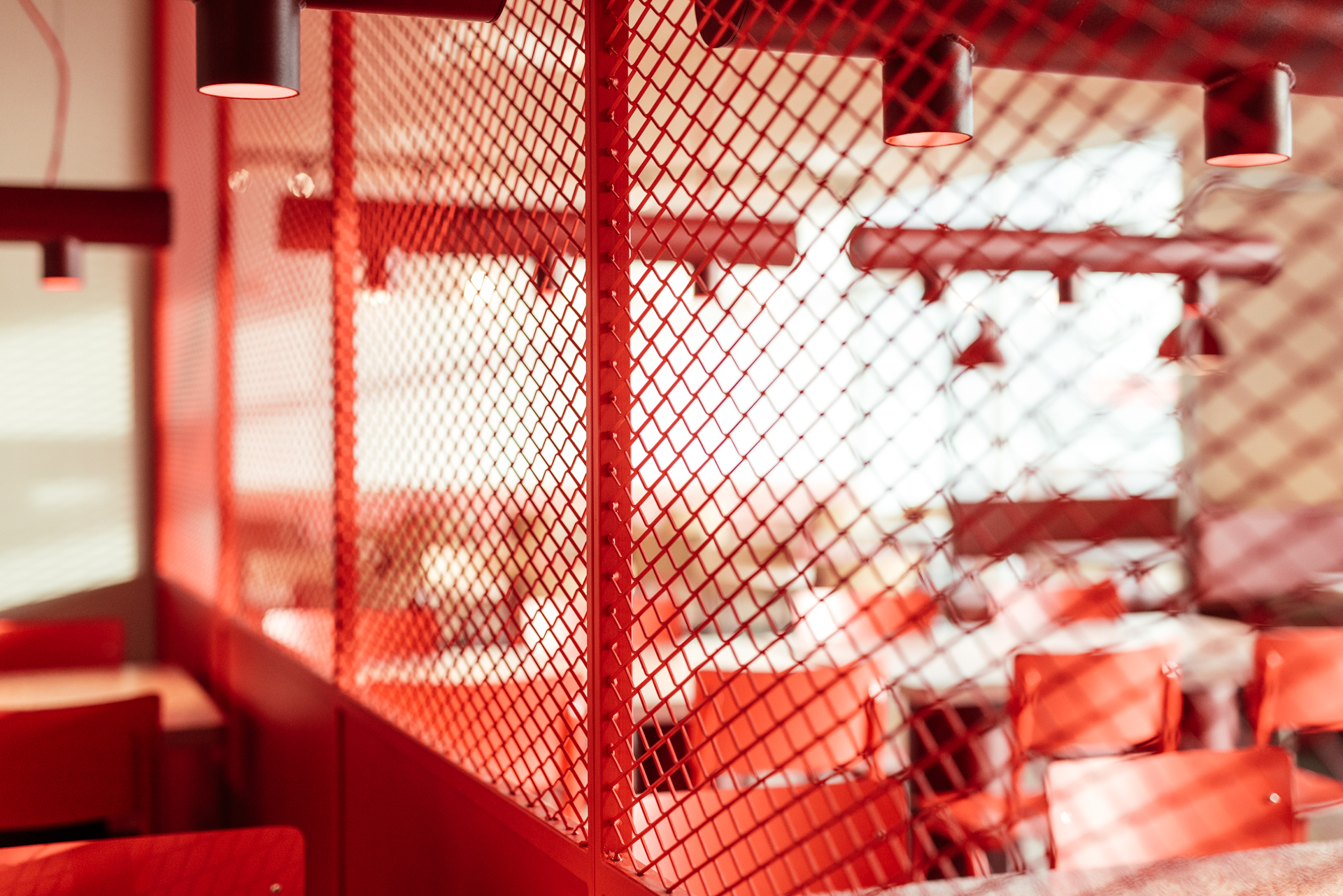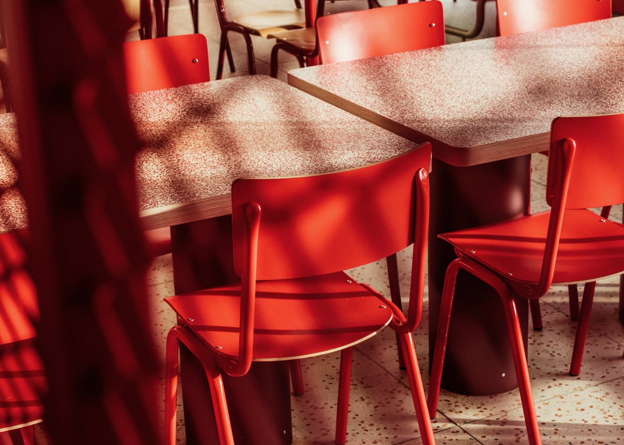 Pleasure is reflected in the design language and the shades of red. The 'ketchup' tables embody the essence of pleasure (watch the video below). The playful design invites people to sit in various ways, and the shades of red on the tabletops truly catch your eye. The patterns on the tabletops were designed in our HQ and built by our partner Abet Laminati. A party for your eyes. Notice the light dripping from the ceiling? It's a nod to the sauce dripping from your burger, because there's no such thing as too much sauce.