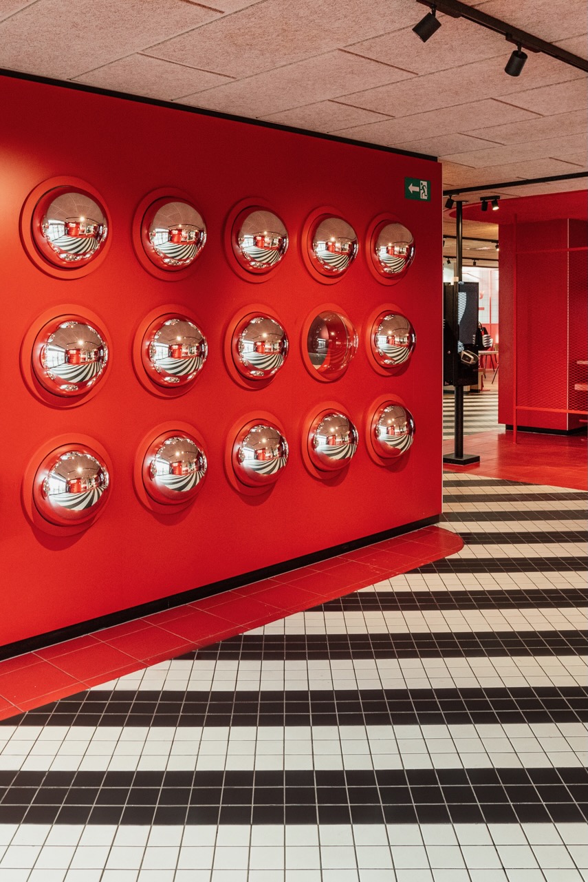 Fritraillette, Bélicatesse, Loïc burger, Quick consistently introduces unique Belgian taste. We also brought a touch of local taste into the interior. The mirror balls at the entrance are a nod to the iconic Atomium. Additionally, we collaborated with Belgian photographer Renaat Nijs. He spent a day in Herstal capturing the local red in some artwork.