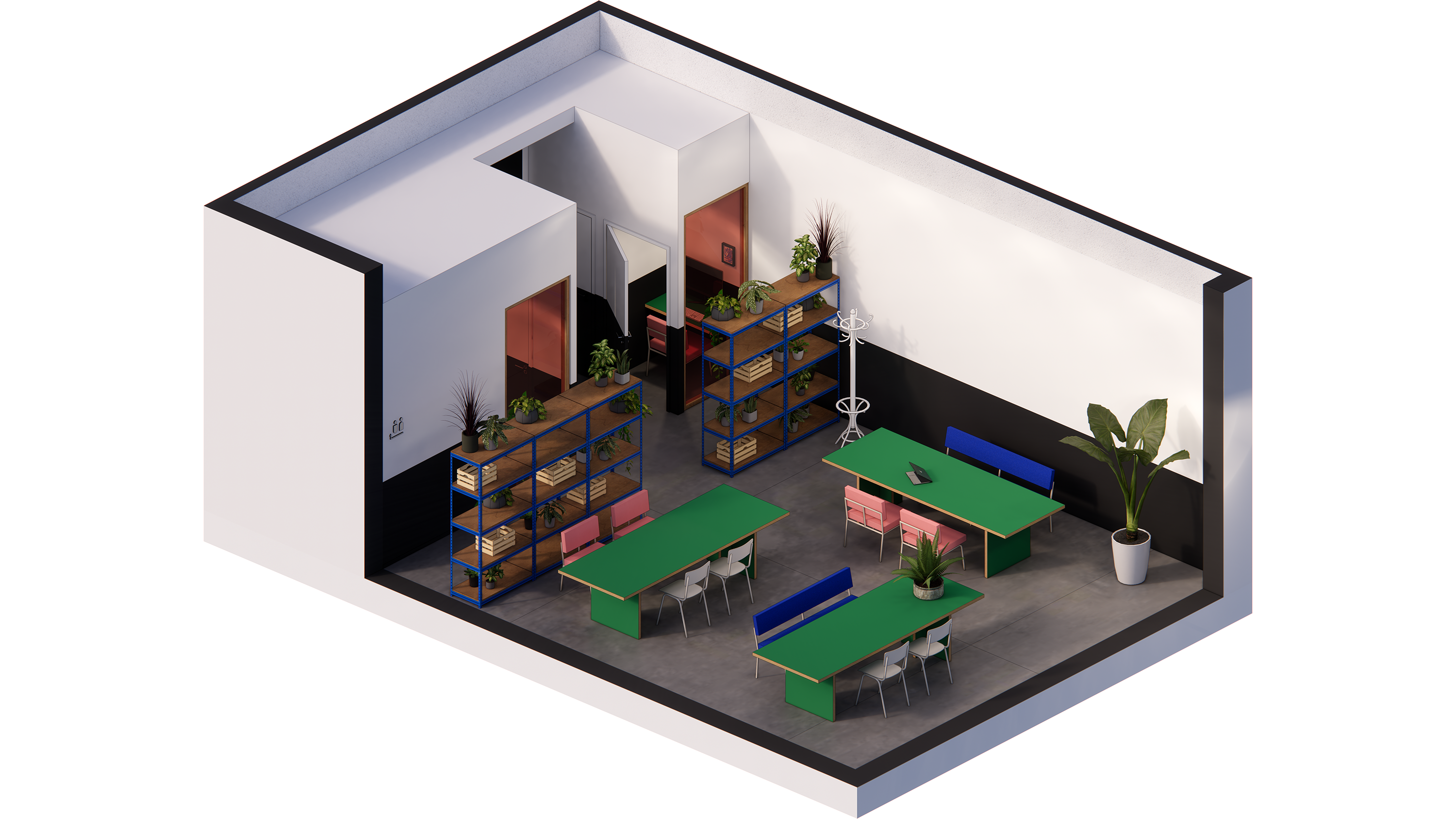Creneau's task included transforming the existing café area and its adjacent multi-purpose rooms into an interior that could seamlessly function as both a café and an office concurrently. This led to a sustainable concept, where spaces that remain vacant for half of the day (given the café's afternoon/evening opening) were ingeniously repurposed for an alternate use: as an office.