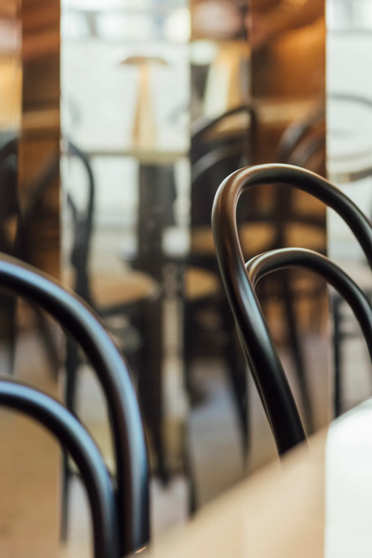 At the designer outlet in Roermond, you can now immerse yourself in the ambiance of a French bistro, Chez Margot. Wim Roggeman's globe lamps, the wall panelling crafted in our own studio, and the mirrored wall with a nod to the staircase of Coco Chanel on Rue Cambon in Paris all contribute to the unmistakable Parisian atmosphere.