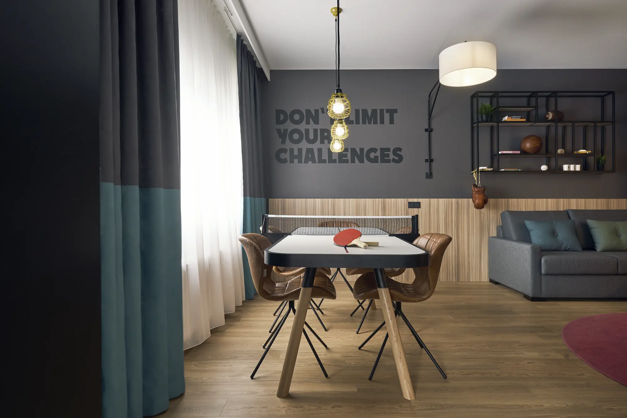 This is what we wanted to incorporate in the interior: it had to be fun, playful, not too serious with a very sporty twist. So no, the soccer room did not make it into the design.