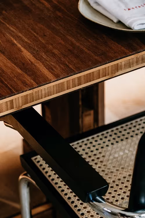 But it wasn’t just about finishes—the same craftsmanship extended to the furniture. Bamboo wood was used throughout, with its distinctive layered structure intentionally exposed as a design detail. Every table was designed and crafted in our own atelier in Hasselt. For the cement-finished tables, we partnered with a local company, Piscinas de Cemento, which, coincidentally, also has a production facility in Belgium. Their unique finish—blended with small fragments of terracotta—was also applied to the outdoor bar, creating a cohesive design language throughout the space.
