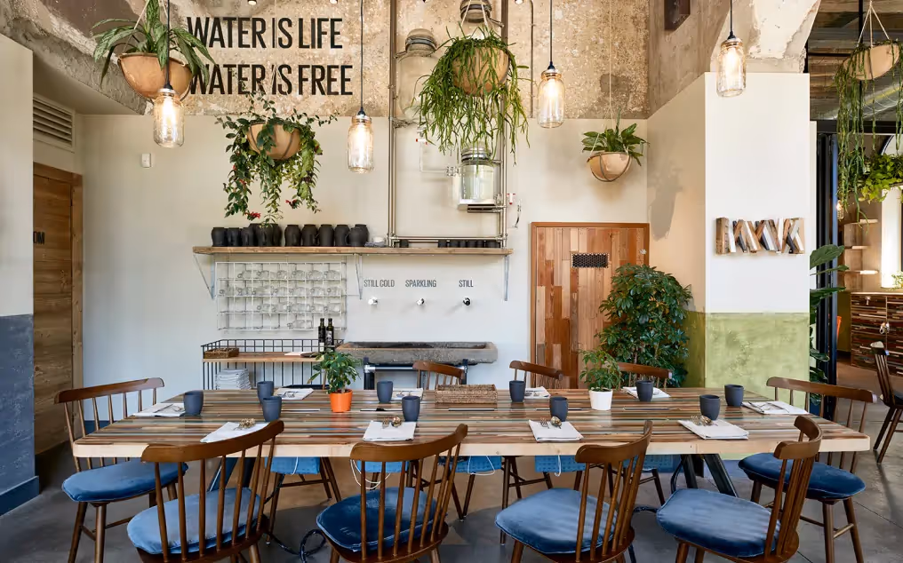 Because Soulgreen is an ecological and sustainable concept, we went looking for collaborations with local partners. We commissioned local recycling talents from Controprogetto to create some compelling wooden furniture. The glass lamps by Dutch designer Sander Wassink consist of re-used tableware. Feel like a glass of water? Just serve yourself from the large water filtering system, which is, to our minds, one of the real eye-catchers of this restaurant.