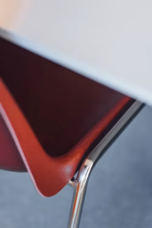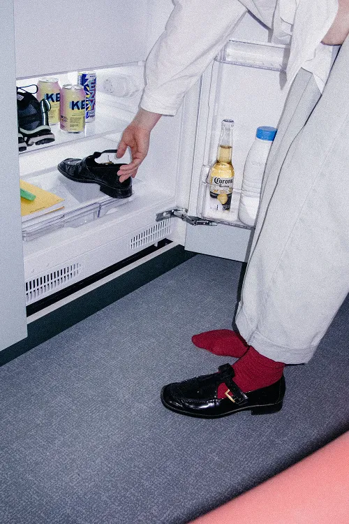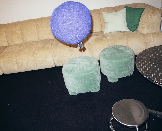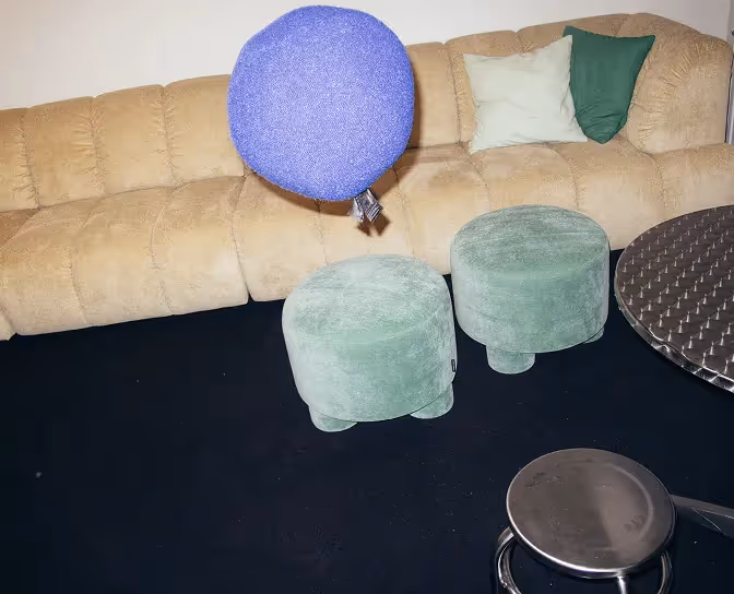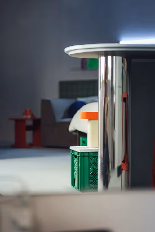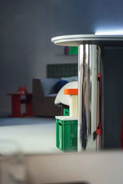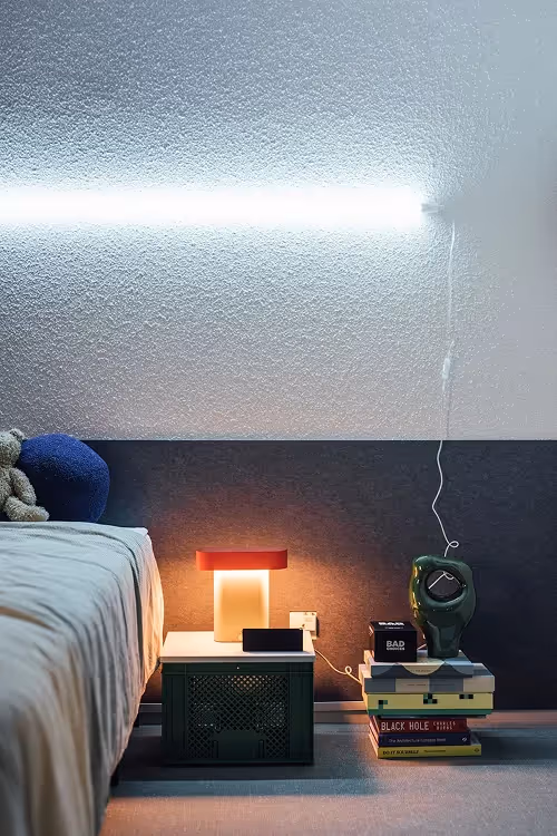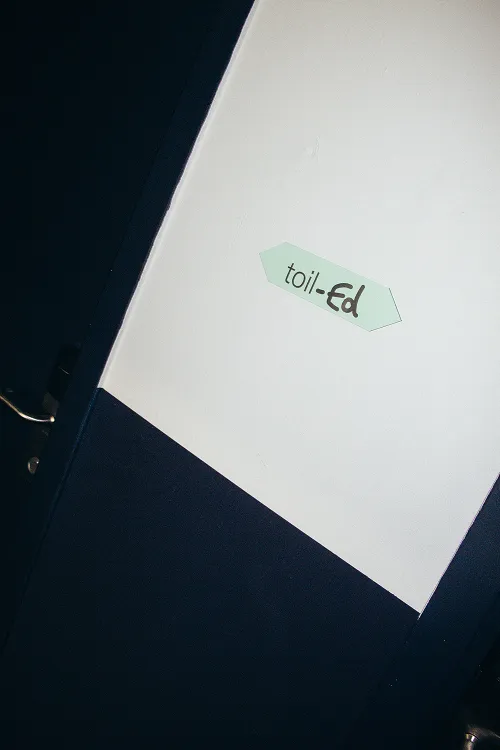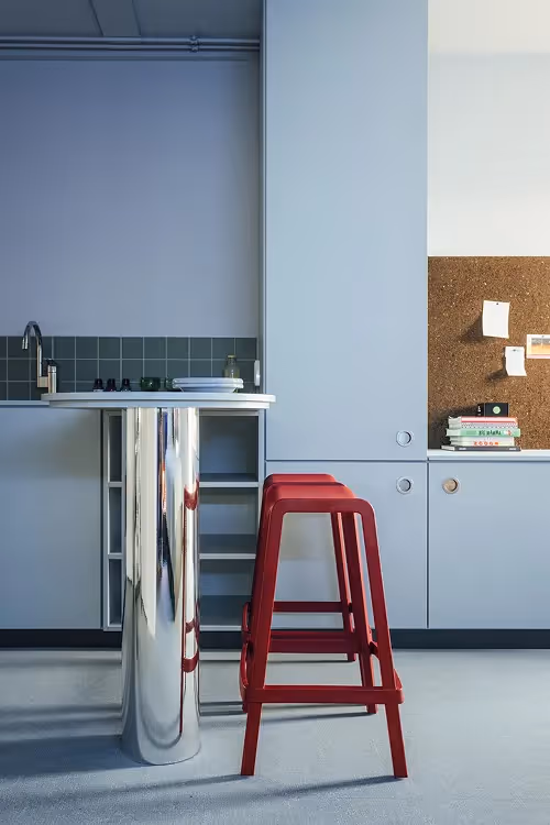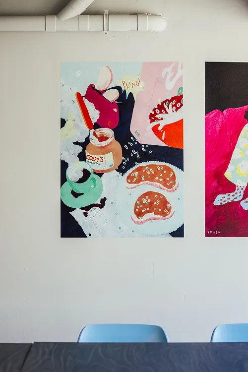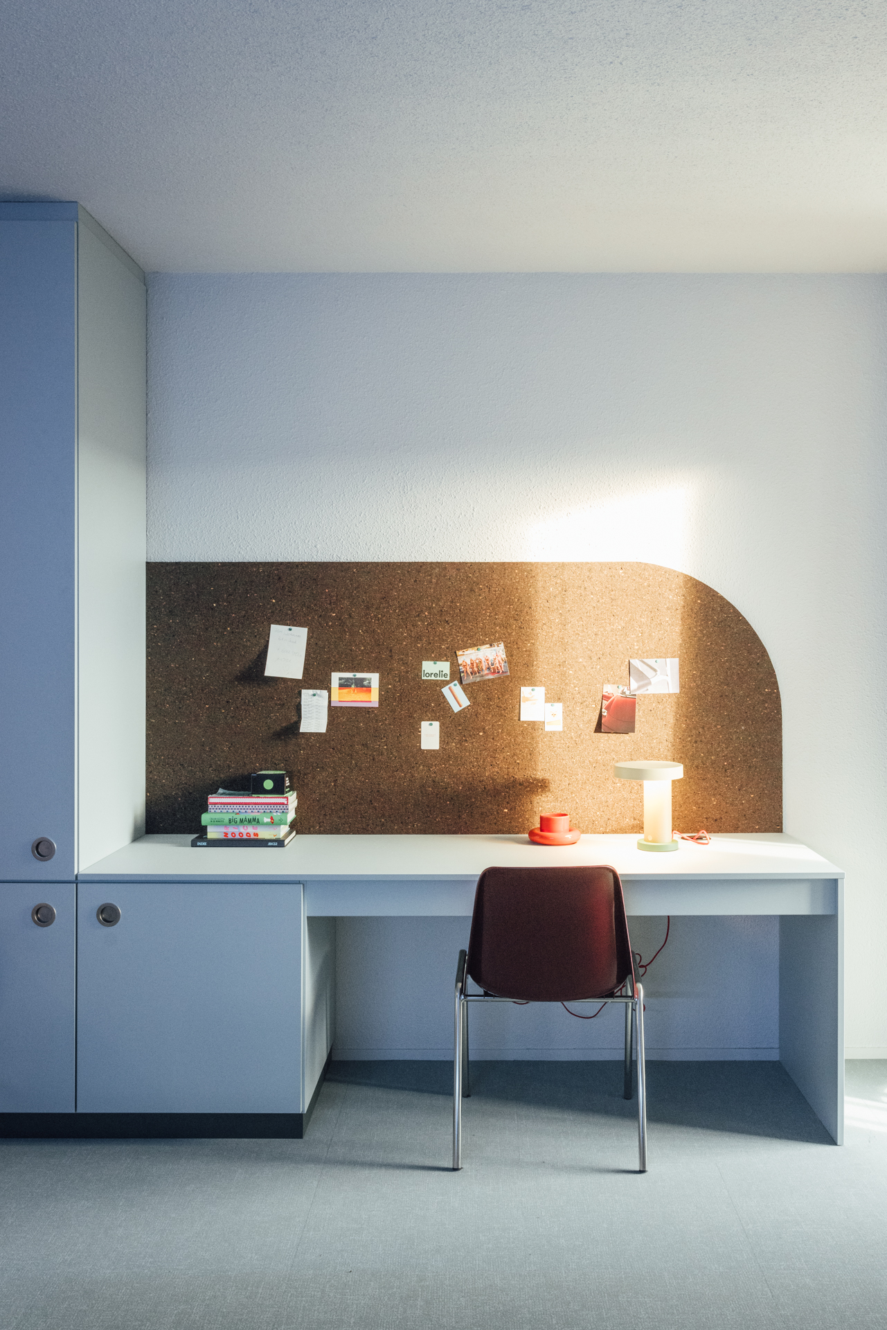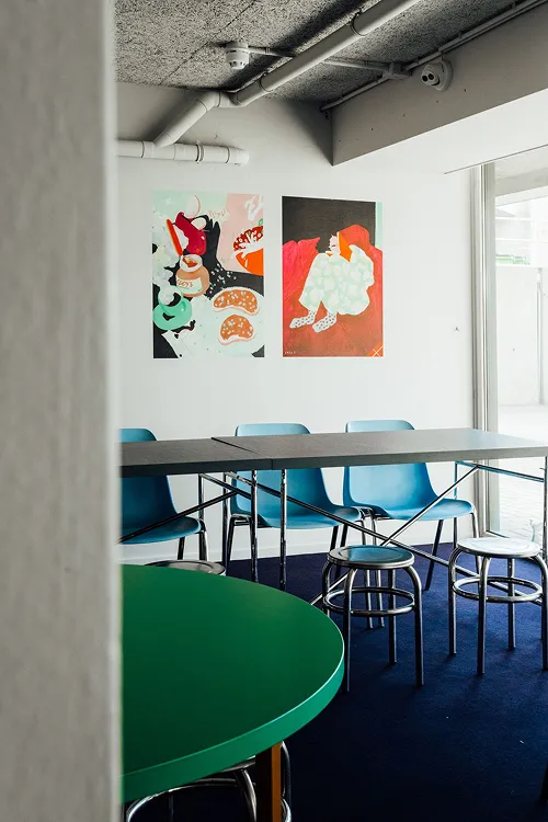The process was intense—decisions had to be made fast, and the timeline was unforgiving. A standard, one-size-fits-all design was never an option. We deliberately pushed for a raw, grungy underground aesthetic that not only resonates with the Gen Z mindset, but also made smart use of the building’s existing features, like exposed concrete walls and ceilings.By leaning into what the space already offered, we were able to allocate more budget to areas where it would really make a difference: public zones, custom light blue cabinetry paired with a grey-green carpet floor, bold lighting choices, classic bordeaux canteen chairs with chrome legs, and of course—the fluorescent green Ed poster, a playful nod to underground party flyers.