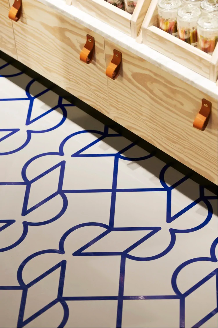 Did you look at the floor? A basic cast floor catches the eye because of the custom-made, heart-shaped stickers that refer to the shop’s name. The beautiful leather details in the upholstery of the furniture and the suspension of the shelves are worth mentioning as well. They add a nice touch of character to the design.