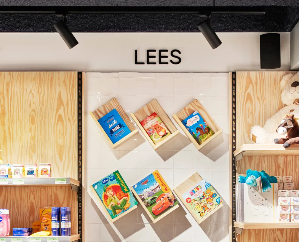 The shop’s interior includes a variety of options: midshops, low tables, wall racks, … This way products are presented in an orderly yet attractive manner.